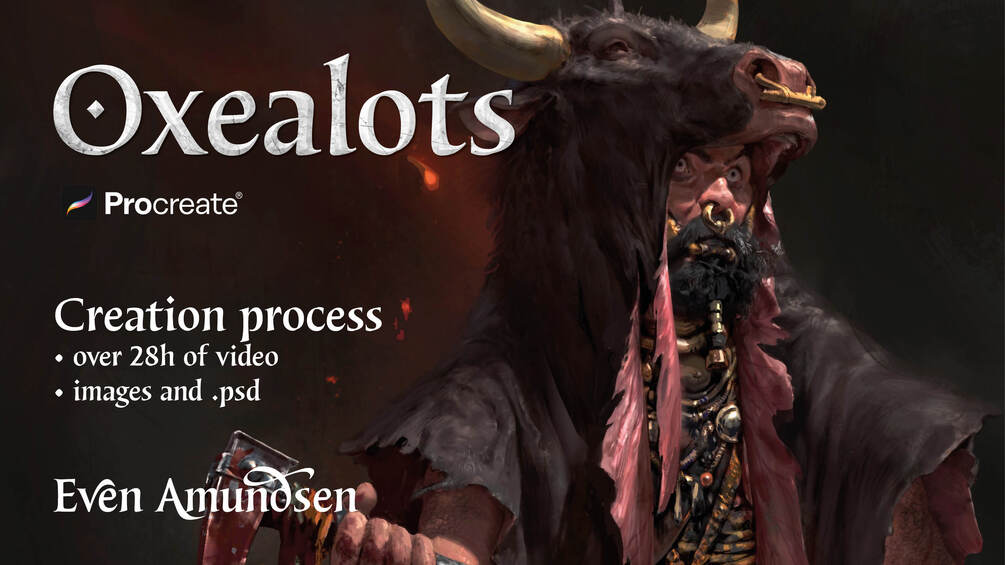 This is the process material of Oxealots with over 28 hours of recorded streaming, showing everything in real-time, and a narrated 43 mins long video with a speed process exported from Procreate where I describe the creation process. This is not to be confused with a tutorial as more of a guide through my thought process and workflow, where I answer questions along the way.